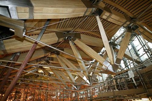 - In the debating chamber,The roof consists of three large wooden trusses with 120 knots, and fabricated stainless steel connectors in Aberdeen especially for the building.