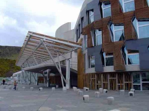 - The building of parliamentarians: 6-storey linear building located in the West. Inside offices are located-cells manufactured with a vaulted ceiling. Each module has 15 m2 and weighs 18 tons. The facade is defined by 114 windows bay window (cantilever and provided with a seat). The form of these is based on the profile of a famous painting by Raeburn.