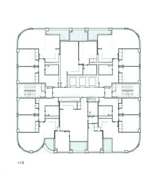 The extruded from a plant type that accounts for the complex program of social housing tower, developed in height from a double socket until a curved top designed with aerodynamic principles.