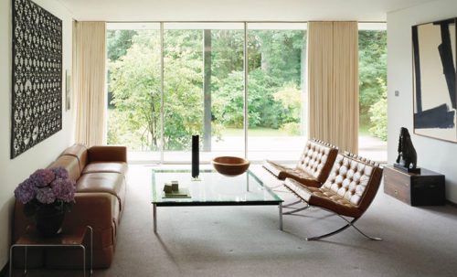 Elegantly built on the field, version House Farnsworth of Mies van der Rohe Tallon who was following, the interior spaces appear a continuation of the external landscape. Originally fronts were closed with concrete blocks and all the open house to the north and south sides with sliding glass panels and continuous receding 1.2 meters to create a terrace all along both sides of the house. The Iroko wood decks gently connect with grass terraces with floating stairs.