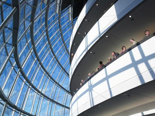 The lobby areas have exceptional views across the cityscape over the River Tyne at Newcastle and offering seating areas, cafes and restaurants. A colored glass balustrade runs along the front of the esplanade and connect with public walkways outside the building.