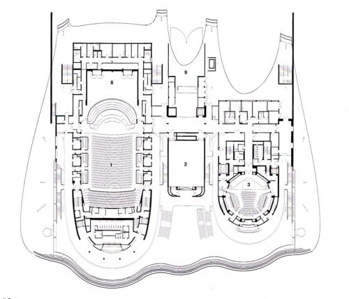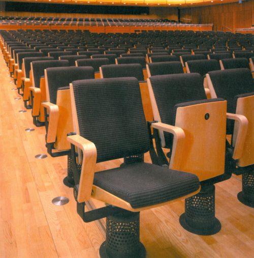 The seats in the main hall were placed in a concave shape to maximize the view of the stage. Each seat has an adjustable bending soil, which flows the air conditioning up, getting huge energy savings because the air conditioning does not exceed two meters.