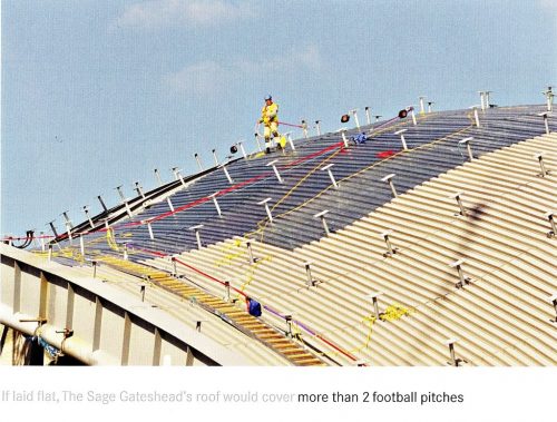 The dramatic curved roof, which weighs 750 tonnes, is composed of 3,000 stainless steel panels and trapezoidal panels 250 flat glass. If the ceiling plane is placed, its 12,000 square meters would be sufficient to accommodate two football fields. Each stainless steel panel, 4m long by 1m wide, has a linen finish to reduce glare. Each panel is solid and is designed to prevent noise of heavy rain may cause a distraction during concert performances.