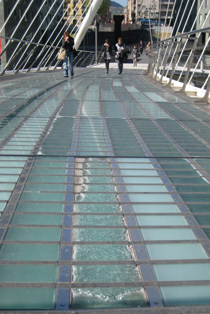 The bridge walkway is made of translucent glass plates and flanked by a railing stainless steel. The use of this material in extremely slippery especially in such a humid and rainy as the city of Bilbao place pedestrian crossing has led the council to cover it with a carpet screw on the side, responding thus to the numerous complaints the users.