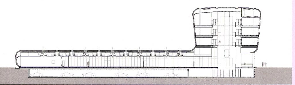 In turn, the whole building sits on a large expanse of green and undermines the underground parking, suggesting the structure of piles which provides visual permeability and fluidity of the landscape, which increases the monumentality of the work and morphology abstract.