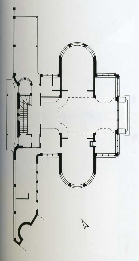 You can match the input space communicates with the living room of double height sketches made in 1911 in Pompeii recalls the distribution of Villa Diomedes around the atrium. This space houses the large flat situated at the junction between the longitudinal axis from the entrance to the garden and the transverse axis that connects downstairs game room with dining area, one on each side of the living room so do not call in question the centrality of the main room and the space it creates.