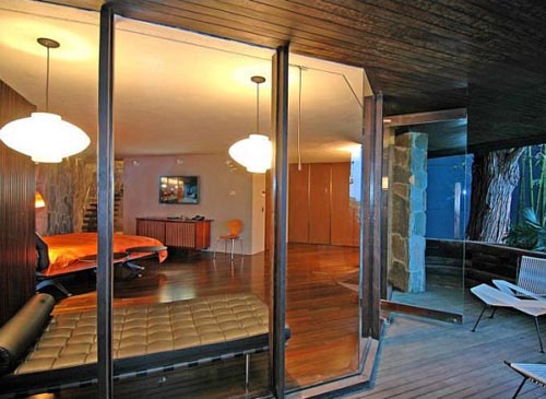 This magnificent home was designed and built by John Lautner in 1961. In her transition from inside to outside pavement moves to the walls and the spaces between the stone walls and the inner glazing.