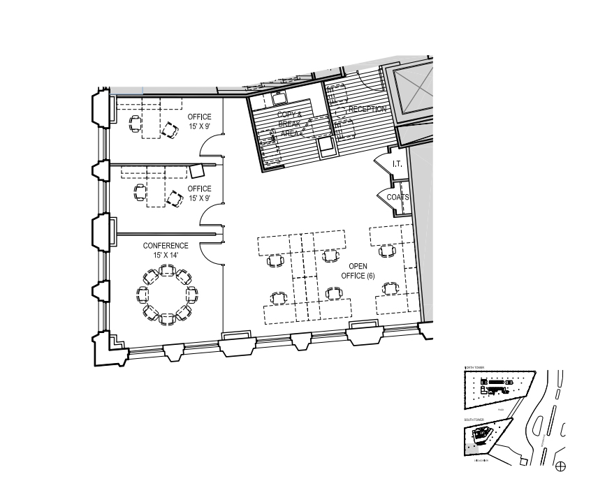 Charles Beersman, the Graham, Anderson, Probst & White architect who led the design, gave the south building a trapezoidal body that takes full advantage of its angular site. On top of this block, he placed a huge 12-story tower.