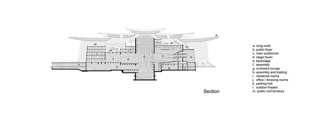 The exterior architectural image of the Teatro Wuxi Grand, consists of eight leaves, or wings, which together with the stone base to which they are attached offer like the flight of a butterfly coming down to rest on the lake Wu-Li figure. This sculptural and artistic form, which reaches 50 meters high from the base of the terraces, makes the new Wuxi Center for the Performing Arts has become a landmark building.